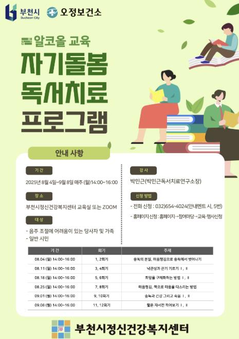 프로그램은 총 6주간 12회기로 구성되며, 음주 조절에 어려움을 겪고 있거나 건전한 음주문화에 관심 있는 시민은 누구나 참여할 수 있다. 신청은 8월 1일까지 선착순으로 부천시정신건강복지센터 홈페이지 또는 전화로 접수한다.