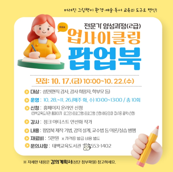 [파이낸셜경제=조성환 기자] 강원도교육청 태백교육도서관은 10월 28일부터 11월 26일까지 지역 내 지속 가능한 친환경 교육문화 확산 과 환경교육 전문 인력 양성을 위해 ‘2025년 업사이클링 팝업북 강사 자격과정’을 운영한다.