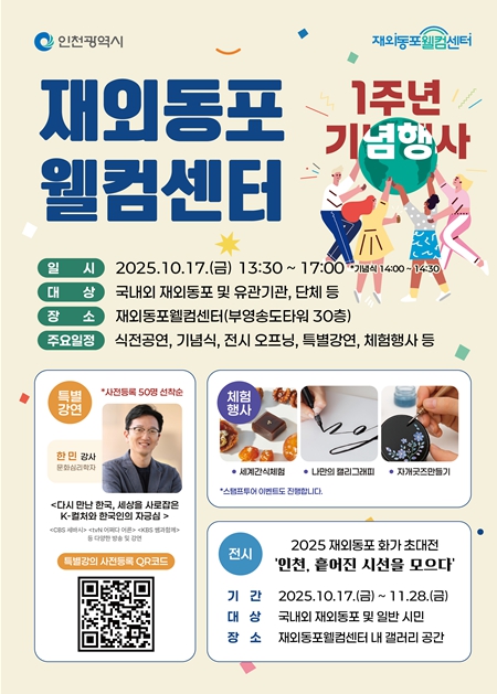 아울러 재외동포웰컴센터 내 갤러리에서는‘2025 재외동포 화가 초대전-인천, 흩어진 시선을 모으다’가 전시 오프닝을 시작으로 재외동포 작가 32명이 참여한 47점의 작품을 선보이며, 11월 28일까지 시민들에게 공개된다.