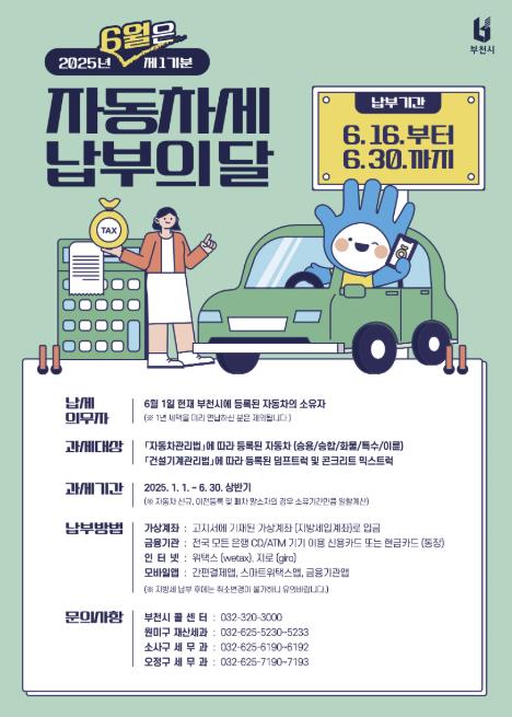 자동차세는 매년 6월과 12월 두 차례 부과되며, 이번 6월 1기분은 과세기준일인 6월 1일 현재 자동차등록원부에 부천시로 등록된 자동차, 125cc 초과 이륜차, 건설기계 소유자에게 부과한다.