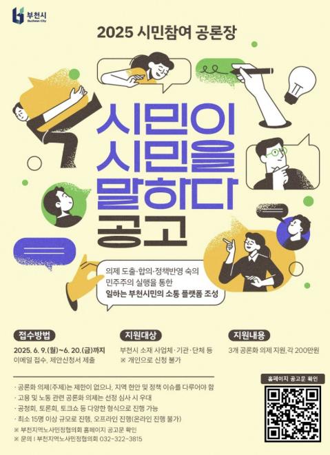이번 사업은 시민이 직접 지역 현안을 학습하고 논의하며 대안을 제안하는 ‘부천형 숙의 모델’을 구축하기 위한 것으로, 총 3개 공론화 주제를 선정해 주제별 200만 원을 지원할 예정이다. 이는 지난해 진행한 ‘시민참여 작은연구’의 연속 사업이다.