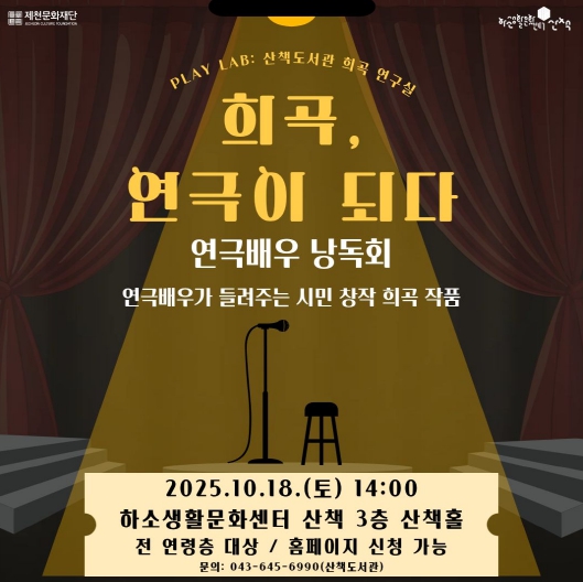[파이낸셜경제=김기보 기자] 제천문화재단(이사장 김상수)이'2025년 문학상주작가 지원사업'의 일환으로 상주작가와 마지막 문학프로그램인 '희곡, 연극이 되다' 연극배우 낭독회를 오는 18일 하소생활문화센터 산책에서 선보인다.