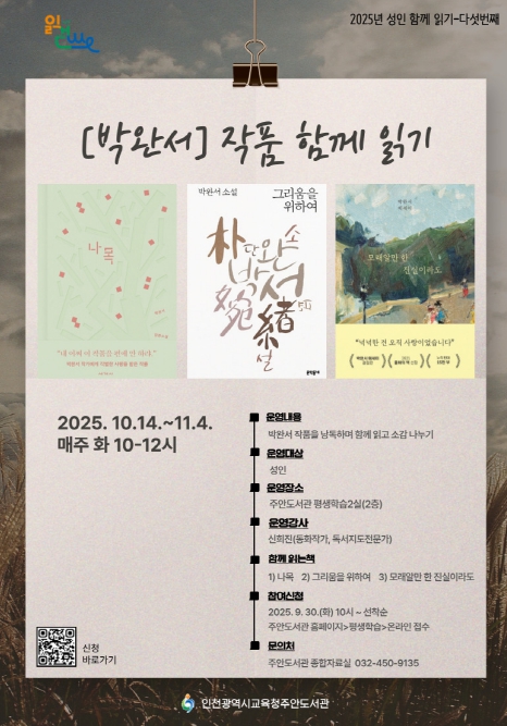 [파이낸셜경제=김기보 기자] 인천광역시교육청주안도서관은 10월 14일부터 11월 4일까지 운영하는 ‘2025년 성인 함께 읽기-'박완서 작품 함께 읽기'’ 프로그램 참여자를 모집한다.