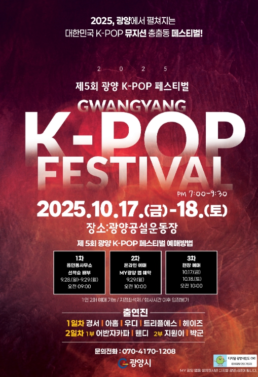 이현주 관광과장은 “제5회 광양 K-POP 페스티벌이 예매 시작과 동시에 빠르게 매진되는 등 뜨거운 열기로 글로벌 축제의 위상을 보여주고 있다”며 “남아 있는 2일 차 일부 좌석도 빠르게 소진될 것으로 예상되는 만큼, 예매를 서두르길 바란다”고 말했다.