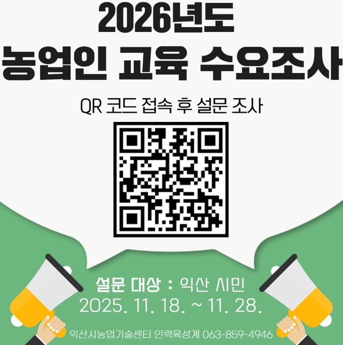 [파이낸셜경제=김예빈 기자] 익산시가 농업인의 실제 필요를 교육 정책에 반영하기 위해 '2026년도 농업인 교육 수요 조사'를 시작했다.