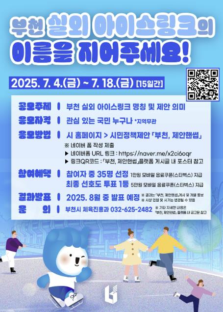 부천시 관계자는 “이번 공모전을 통해 실외 아이스링크의 특성과 부천의 지역적 특색을 잘 담은, 참신하고 기억에 남을 시민 아이디어가 많이 접수되길 바란다”며 “선정된 명칭이 시민들에게 오랫동안 사랑받고, 부천을 대표하는 겨울 명소로 자리잡는 데 기여하길 기대한다”고 말했다.