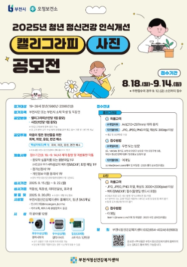공모전은 부천시에 거주하거나, 부천시 소재 직장 또는 학교에 다니는 19세부터 39세 이하 청년을 대상으로 한다. 참가자는 작품을 통해 청년의 다양한 경험과 메시지를 시각적으로 표현할 수 있으며, 시는 수상작을 온오프라인 홍보에 활용해 정신건강사업에 대한 관심을 높이고, 정신건강서비스의 접근성과 친밀성을 강화할 계획이다.