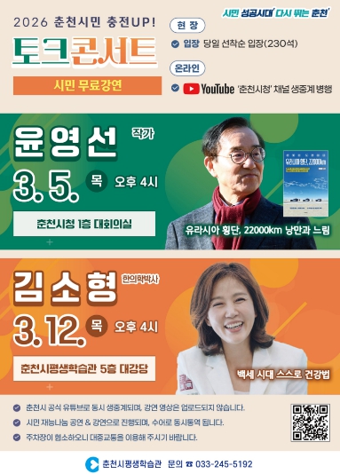 강연에 앞서 5일에는 ‘동면색소폰동호회’, 12일에는 ‘춘천실버오케스트라’의 재능나눔 공연이 펼쳐져 시민이 쌓아온 평생학습 성과를 함께 나누는 시간도 마련된다.