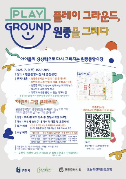이번 행사는 원종동 도시재생사업의 주요 공간인 원종중앙시장을 중심으로 어린이, 가족, 주민이 함께 참여하는 프로그램으로 진행된다. 오후 3시부터 8시까지 열리며, ‘어린이 그림 콘테스트’를 통해 지역 아이들이 상상력으로 다시 그리는 시장 공간을 선보이고, 원종중앙시장 중정 환경 공사 이전 모습을 기록하는 도시재생 아카이빙도 함께 추진한다.