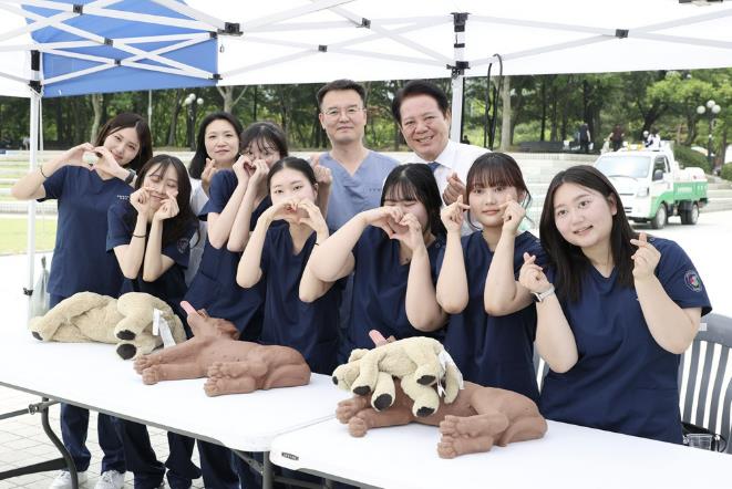 | ▲ 6월 7일 열린 반려동물 사랑나눔 축제서 연성대 반려동물보건과 학생 및 이왕희 교수(뒷줄 오른쪽 두번째) 이수정 교수(뒷줄 오른쪽 세번째) 최대호 안양시장(뒷줄 오른쪽 첫번째)이 기념사진을 찍고 있 |