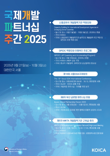 [파이낸셜경제=전병길 기자] 외교부는 9월 21일~10월 3일 간 서울에서 한국국제협력단(KOICA)과 공동으로 '2025 국제개발 파트너십 주간'을 개최한다.