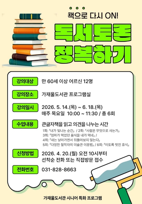 ‘독서토론 정복하기’는 5월 14일부터 6월 18일까지 매주 목요일 오전 10시부터 11시 30분까지 총 6회 운영된다. 노인 12명을 대상으로 하며, 큰글자도서를 활용해 보다 편안하게 책을 읽고, 함께 생각과 감상을 나누며 공감과 소통의 시간을 가질 수 있도록 마련했다.