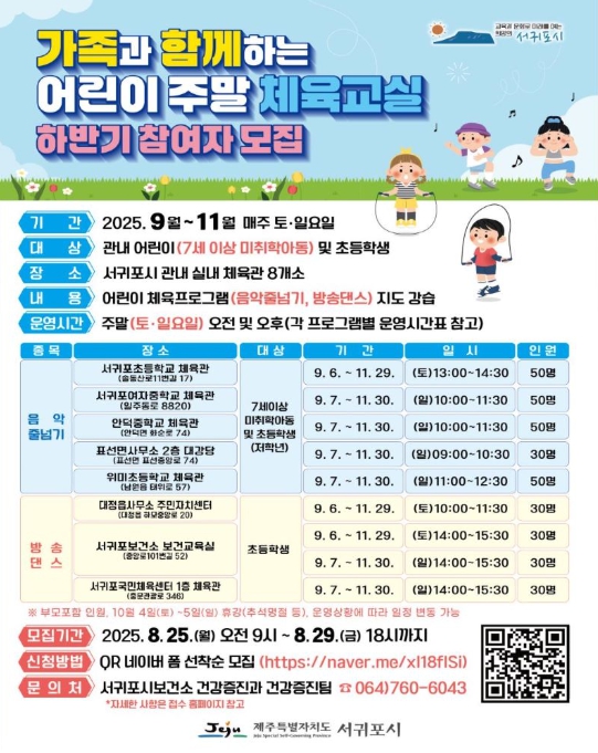 [파이낸셜경제=김영란 기자] 서귀포시는 신체활동 증진과 건강한 운동습관 형성을 위해 ‘가족과 함께하는 어린이 주말체육교실’ 하반기 프로그램을 개설하고 8월 25일부터 8월 29일까지 참가자를 모집한다.