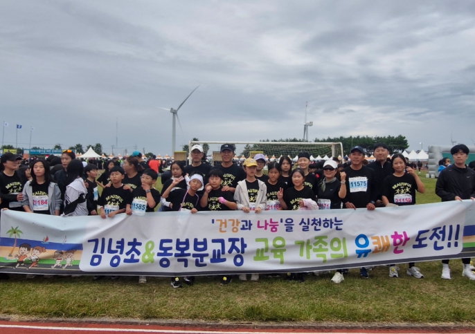 김녕교육가족은 ‘건강과 나눔을 실천하는 유쾌한 도전’을 주제로 지난 9월부터 러닝 전문 강사와 함께 교직원 연수와 학생 수업을 병행하며 체계적으로 준비해 전원이 10km 코스에 도전했다.