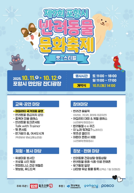 [파이낸셜경제=김지훈 기자] 포항시는 오는 10월 11일부터 12일까지 만인당 잔디광장에서 ‘제9회 포항시 반려동물 문화축제’를 개최한다.
