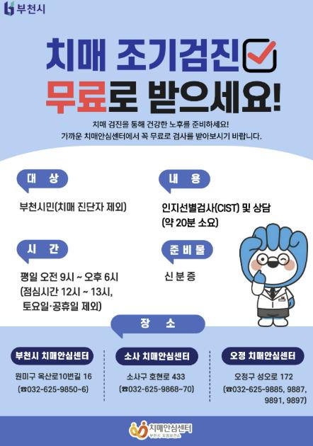 치매 조기검진 대상은 치매 진단을 받지 않은 부천시민이며, 검진을 희망하는 경우 신분증을 지참해 가까운 치매안심센터를 방문하면 된다.