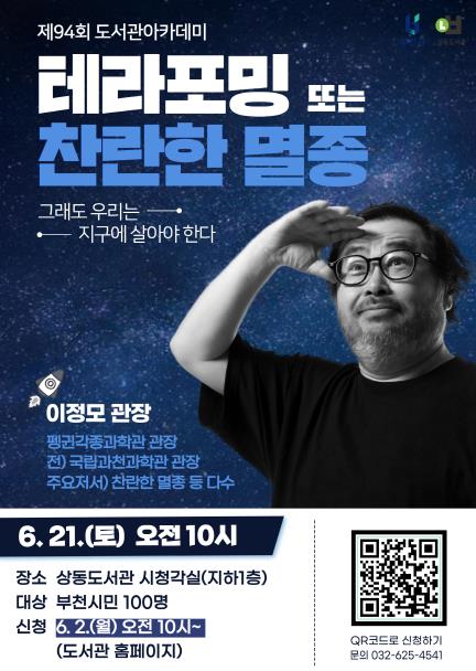 [파이낸셜경제=김기보 기자] 부천시 상동도서관은 6월 21일 오전 10시부터 12시까지 ‘찬란한 멸종’의 저자이자 전 국립과천과학관장인 이정모 관장을 초청해 ‘제94회 도서관 아카데미’를 개최한다.