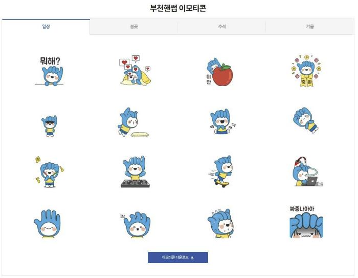 이모티콘은 부천시 홈페이지 부천소개 ' 부천이미지 ' 부천핸썹 이모티콘 또는 통합홍보포털 생생부천 브랜드 ' 부천핸썹에서 내려받을 수 있다.
