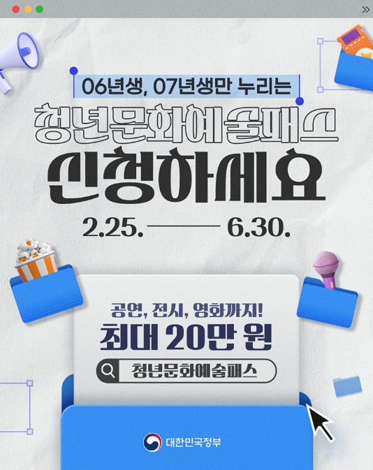 [파이낸셜경제=김영란 기자] 06년생, 07년생만 누리는 '청년문화예술패스' 신청하세요.