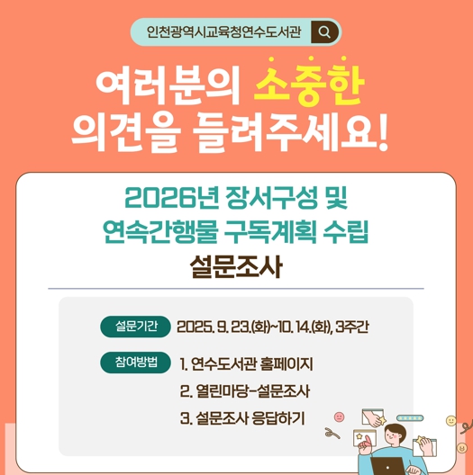 [파이낸셜경제=김기보 기자] 인천광역시교육청연수도서관은 9월 23일부터 3주간 ‘2026년 장서 구성 및 연속간행물 구독 계획 수립’을 위한 설문조사를 진행한다.