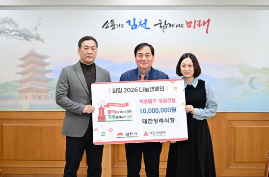[파이낸셜경제=김지훈 기자] 김천시는 지난 1일, 태찬장례식장이 이웃돕기 성금 1,000만 원을 전달하며 희망2026나눔캠페인‘김천 1호’ 기부자가 됐다고 밝혔다.