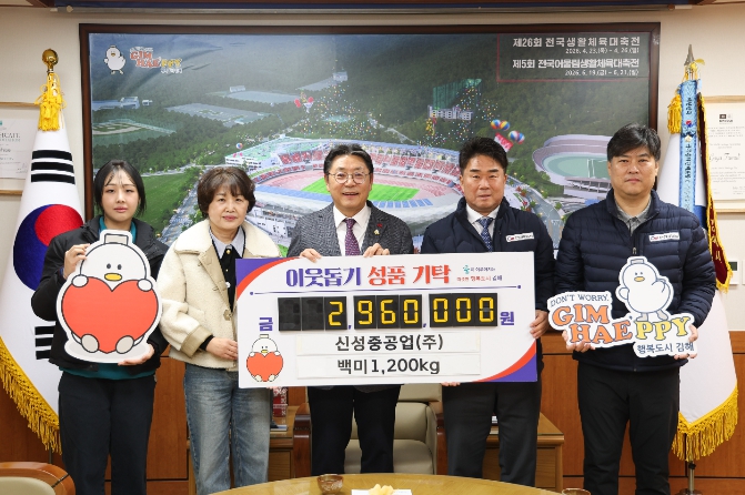 [파이낸셜경제=김예빈 기자] 김해시는 5일 신성중공업(주)에서 제2공장 건립을 기념해 쌀 100포(1,200kg, 296만원 상당)를 기탁했다고 밝혔다.