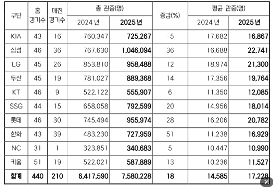 | ▲ 2025년 구단별 관중 현황(2024-2025 홈 경기수 비교) |