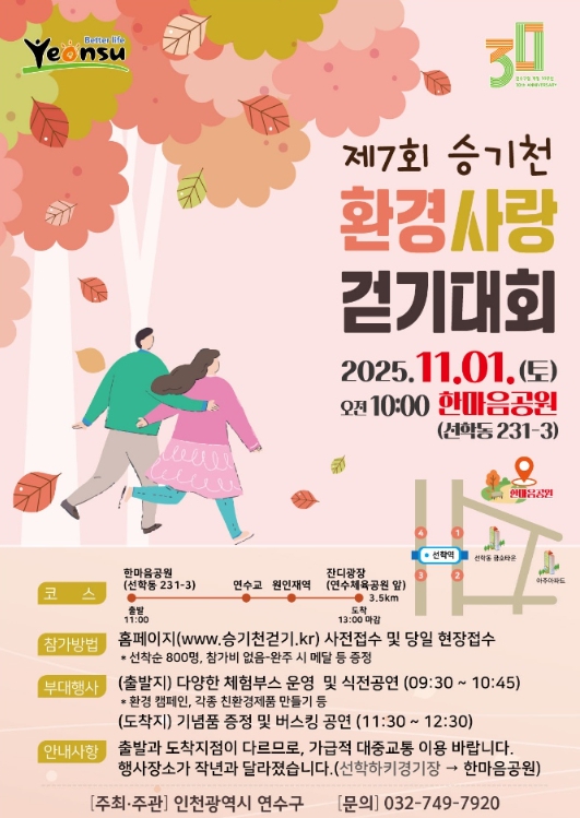 [파이낸셜경제=김기보 기자] 연수구는 오는 11월 1일 오전 10시 한마음공원(선학동 231-3) 및 승기천 일원에서 구민과 함께 자연 속에서 걷는 ‘제7회 승기천 환경사랑 걷기대회’를 개최한다.