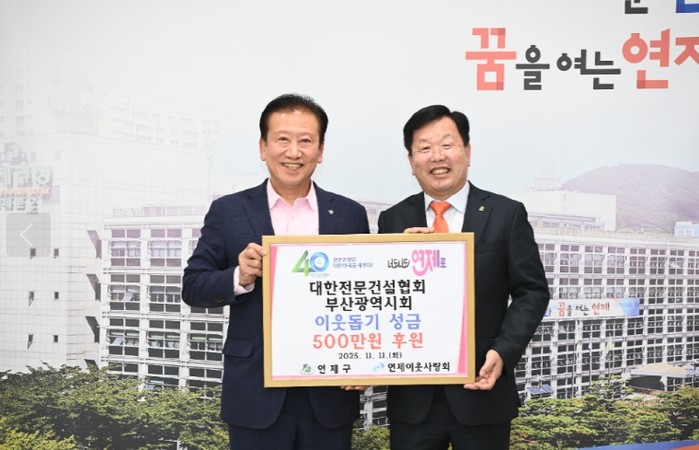 [파이낸셜경제=박영진 기자] 연제구는 11월 11일 대한전문건설협회 부산광역시회(회장 김형겸)로부터 이웃돕기 성금 500만원을 기탁 받았다. 기탁 받은 성금은 취약계층 지원을 위한 사업에 이용될 예정이다.