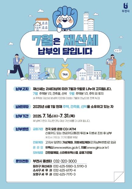 부천시 관계자는 “재산세는 지역사회 발전과 복지 증진을 위한 소중한 재원인 만큼 성실한 납부는 우리 지역과 이웃을 위한 든든한 원동력”이라며 “기한 내 납부해 가산세 등 불이익이 발생하지 않도록 각별한 주의를 부탁드린다”고 말했다