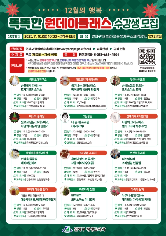 [파이낸셜경제=박영진 기자] 연제구는 11월 10일부터 ‘2025년 제2차 똑똑한 원데이 클래스’ 프로그램 수강생을 선착순 모집한다.