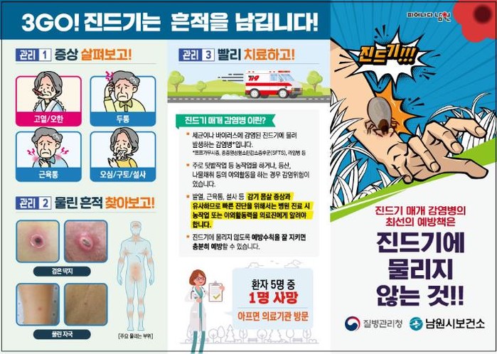 이에 남원시보건소는 9월부터 11월까지 진드기 매개 감염병 집중 예방 기간으로 예방 홍보와 교육을 강화하고 있다.