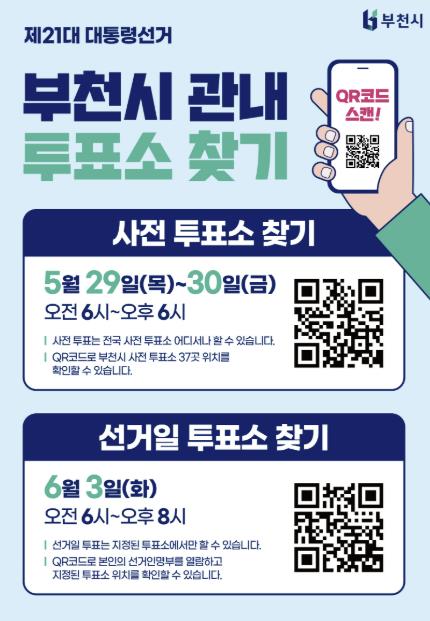 부천시 관계자는 “투표는 민주주의의 근간이며, 국민 모두에게 주어진 소중한 권리”라며 “시민 여러분께서는 사전에 투표소 위치를 확인하고, 반드시 한 표를 행사해주길 바란다”고 말했다.