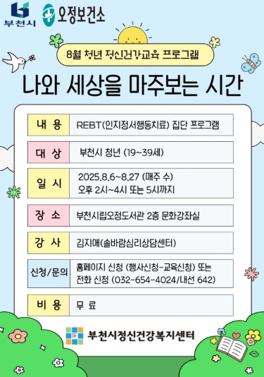 [파이낸셜경제=김기보 기자] 부천시와 부천시정신건강복지센터는 관내 19세부터 39세 이하 청년을 대상으로 심리적 안정과 회복을 돕기 위해 ‘인지정서행동치료(REBT) 기반 청년 마음 성장 프로그램’을 운영한다고 밝혔다.