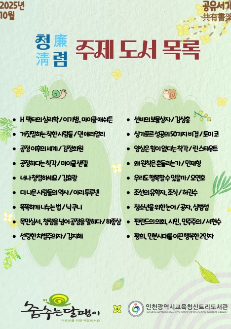 [파이낸셜경제=김기보 기자] 인천광역시교육청 신트리도서관은 10월 1일부터 31일까지 부평구 작은도서관 ‘춤추는달팽이도서관’과 함께 청렴을 주제로 공유서가를 운영한다.