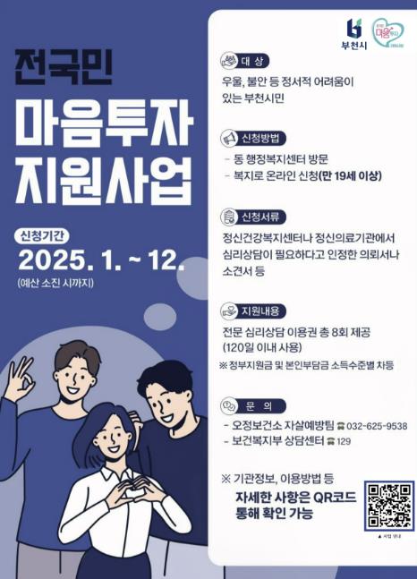[파이낸셜경제=김기보 기자] 부천시는 7월 22일부터 28일까지 ‘전국민 마음투자 지원사업’ 제공기관을 대상으로 현장 조사를 진행한다.