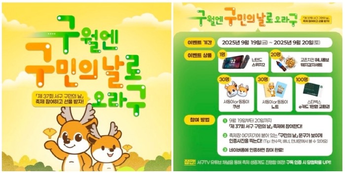 아울러, 서구는 구민들의 적극적인 참여를 통해 이번 구민의 날을 더욱 풍성하게 하고자 행사 양일간 구민의 날 축제 참여 인증사진 이벤트를 진행한다. 이벤트는 서구 홈페이지 배너를 통해 참여할 수 있다.