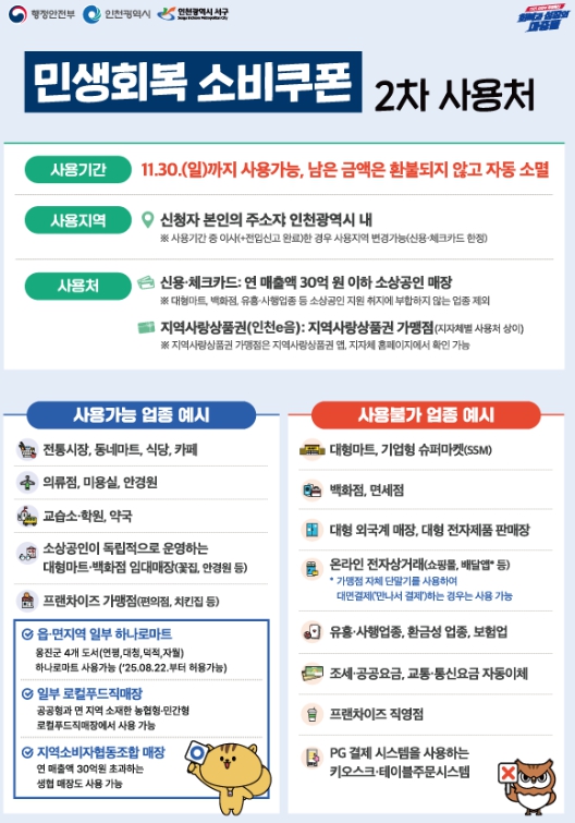 민생쿠폰은 지역사랑상품권(인천e음) 가맹점에서 사용가능하며, 신용·체크카드는 일부 업종을 제외하고 연 매출액이 30억 이하인 음식점, 카페, 동네마트 등 소상공인 매장에서 사용할 수 있다.