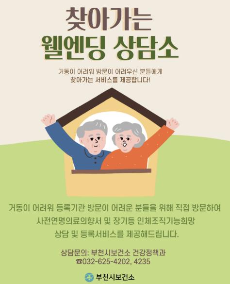 ‘찾아가는 웰엔딩 상담소’는 외출이 어려운 고령자 등을 대상으로 상담 인력이 직접 가정을 방문해 1:1 상담을 진행하고, 필요한 등록 절차를 지원하는 서비스다. 서비스를 이용하려면 어르신이나 보호자가 먼저 부천시보건소에 유선(032-625-4235, 4202)으로 신청해야 한다.