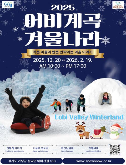 어비계곡 겨울나라 축제장에서는 전통팽이치기, 회전 눈썰매, 전통썰매, 이글루·빙벽 포토존 등 다양한 겨울 체험이 마련돼 있다. 중식 후에는 베고니아새정원을 방문해 온실 그린하우스, 물의 정원, 미디어아트 인피니티존 등 이국적인 겨울정원을 둘러볼 수 있다. 이어 스위스풍 건축물이 조성된 ‘에델바이스 스위스 테마파크’에서 알프스 분위기를 체험하는 일정으로 마무리된다.
