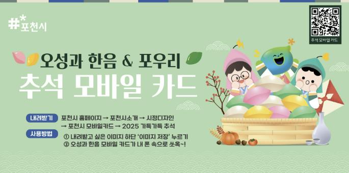 ‘2025 가득가득 추석 모바일 카드’는 총 4종으로 제작했으며, 포천시청 누리집 내 ‘포천시소개 → 시정디자인 → 포천시 모바일카드 → 2025 가득가득 추석’ 메뉴에서 누구나 무료로 내려받아 자유롭게 활용할 수 있다.