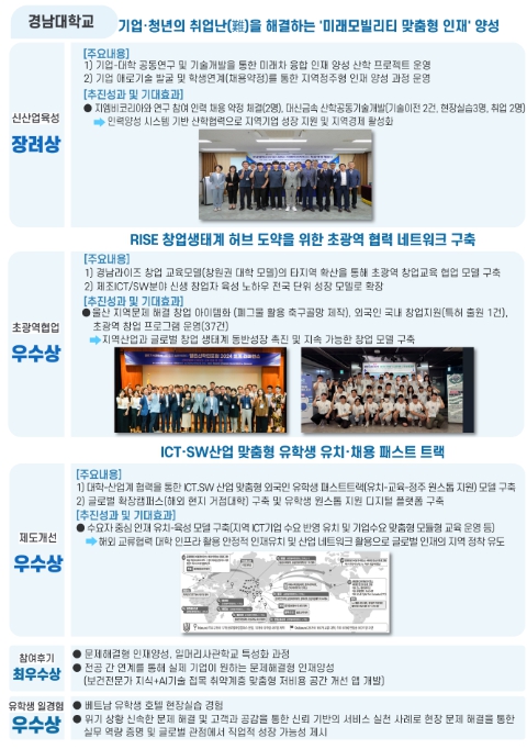 경상국립대학교는 미래차·로봇 분야 맞춤형 인재 양성과 고교-대학-기업 간 연계를 통한 지역 정주형 취업 생태계 조성으로 지역혁신 부문 부처연계 분야에서 대상을 받았다. 110개 기업이 참여한 협의체를 중심으로 고교생의 대학 진학과 취업 약정을 추진하고, 지역 기업으로부터 발전기금 1억 5천만 원도 유치했다.
