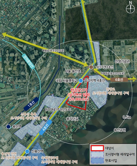 한강로1가 도시정비형 재개발구역은 지하철 4, 6호선 삼각지역 역세권 내에 위치하여 2025 도시환경정비기본계획(2016)에 따라 정비예정구역으로 지정되어 도심 기능연계, 노후 주거환경 정비 등을 목표로 용산구에서 정비구역 지정 및 정비계획(안) 마련을 추진했다.