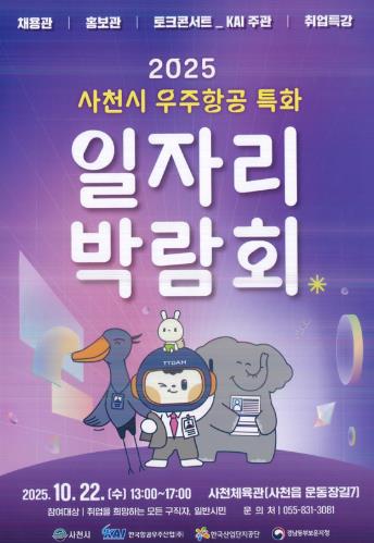 [파이낸셜경제=김예빈 기자] 사천시는 오는 10월 22일 사천체육관에서 항공산업 중심의 청년 고용기회 확대를 위해 ‘2025년 사천시 우주항공특화 일자리박람회’를 개최한다.