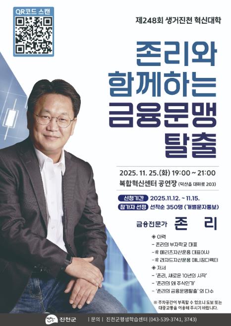 [파이낸셜경제=김기보 기자] 충북 진천군은 오는 11월 25일 충북혁신도시 복합혁신센터 공연장에서 금융 교육의 대가인 금융전문가 존 리를 초청해 제248회 생거진천 혁신대학 강좌를 개최한다고 11일 밝혔다.