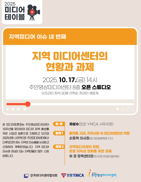 [파이낸셜경제=김기보 기자] 인천 미추홀구 주안영상미디어센터는 오는 10월 17일 오후 2시 센터 오픈 스튜디오에서 ‘미디어 테이블: 지역 미디어센터의 현황과 과제’ 토론회를 개최한다.