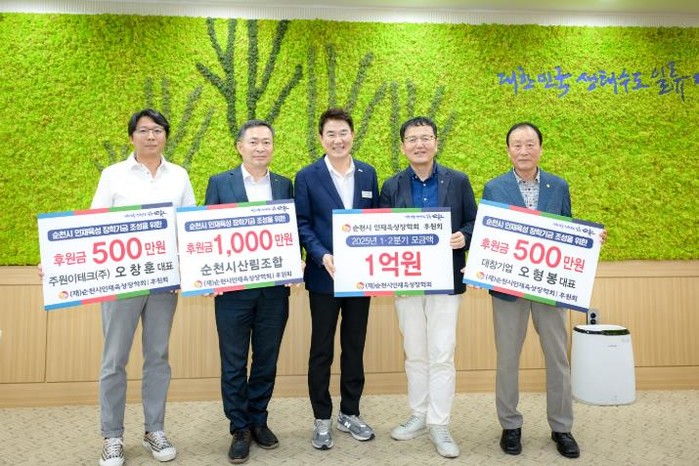 이날 전달식에서는 순천시산림조합(조합장 서용석)이 1천만 원, 대창기업(대표 오형봉)이 5백만 원, 주원이테크㈜ 오창훈 대표(후원회 운영위원)가 5백만 원을 각각 기탁했다.