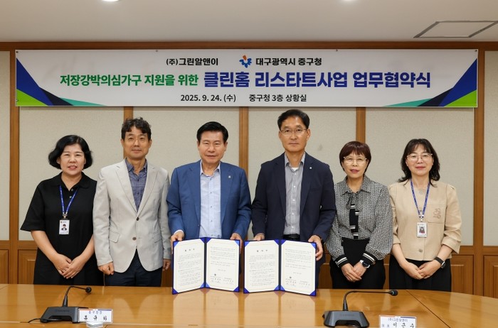 [파이낸셜경제=김지훈 기자] 대구 중구와 ㈜그린알앤이(대표 이근수)는 24일 저장강박의심가구 주거환경 개선과 복지안전망 강화를 위한 ‘클린홈 리스타트 사업’ 업무협약을 체결했다.