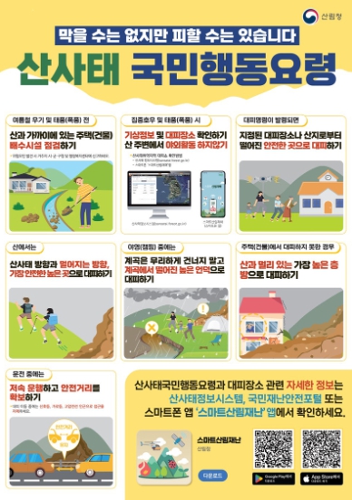 산사태국민행동요령과 대피장소 관련 자세한 정보는 산사태정보시스템, 국민재난안전포털 또는 스마트폰 앱 '스마트산림재난' 앱에서 확인하세요.