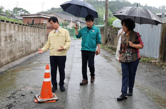 | ▲ 박병규 광산구청장(왼쪽)이 지난 8월 4일 전날 폭우로 피해가 발생한 임곡동 한 마을을 찾아 현장을 살피고 있다. |